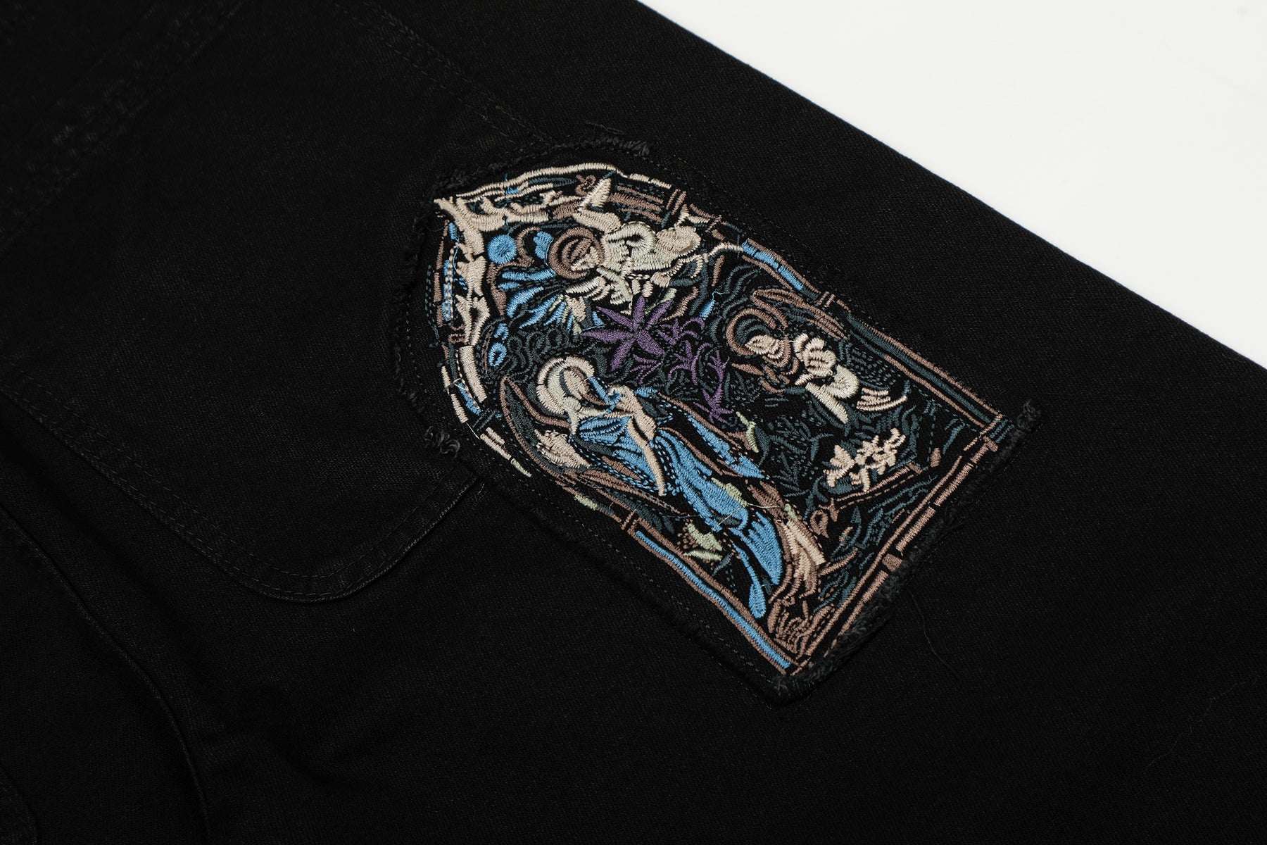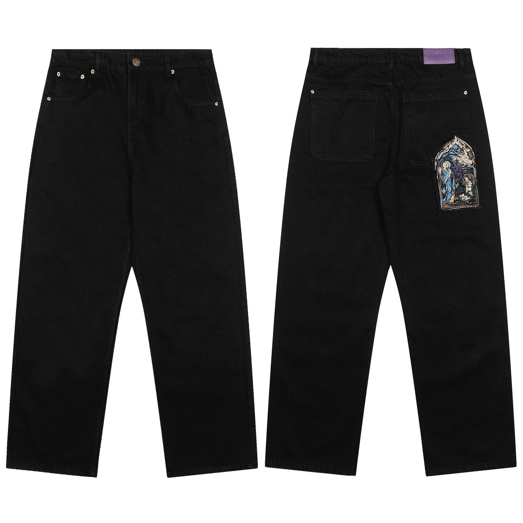 The Derschutze Gallery Denim Jeans feature a vintage washed finish with a relaxed straight-leg silhouette. Detailed with artistic patchwork prints on the back pockets, these jeans blend classic denim construction with creative, gallery-inspired flair — a standout piece for modern streetwear enthusiasts.