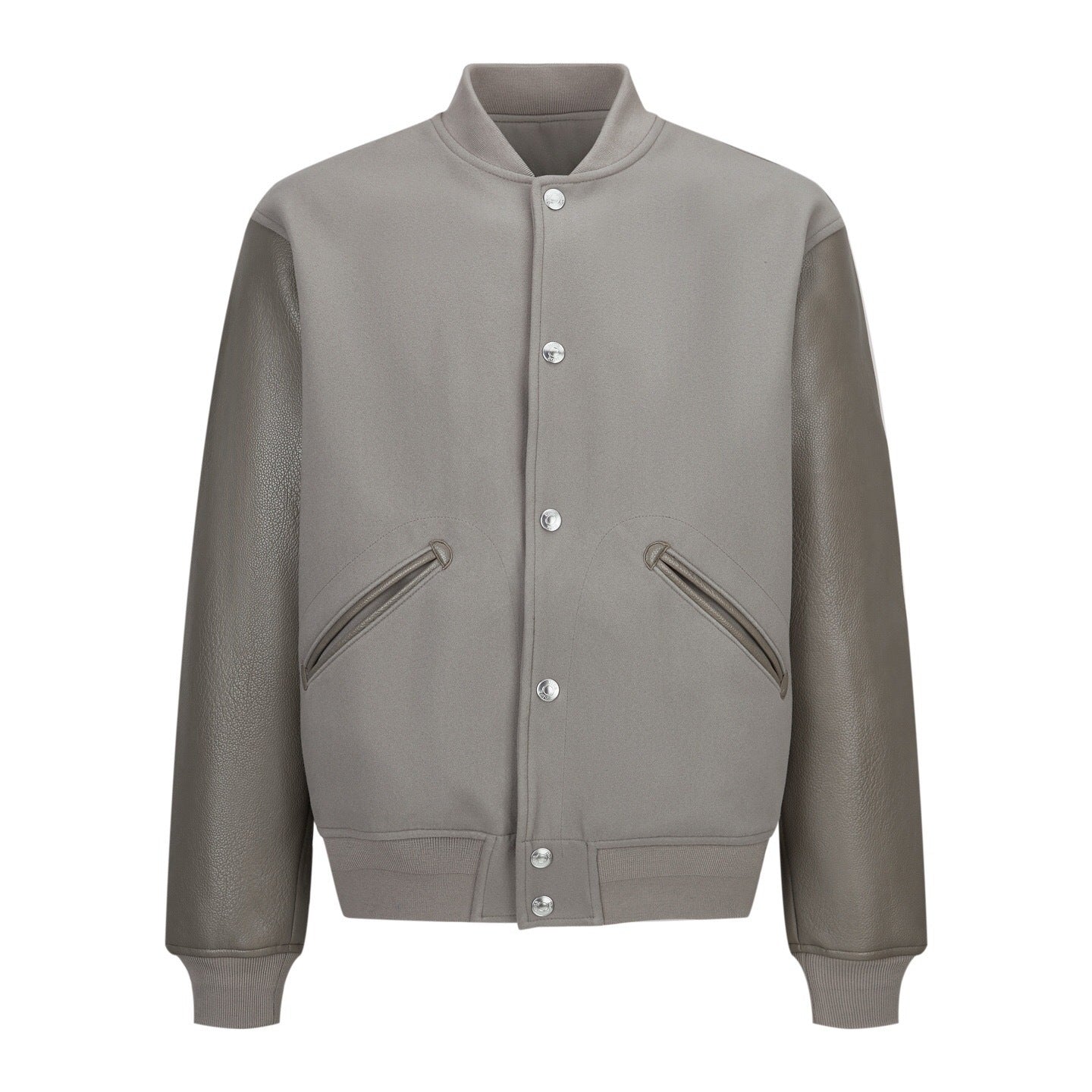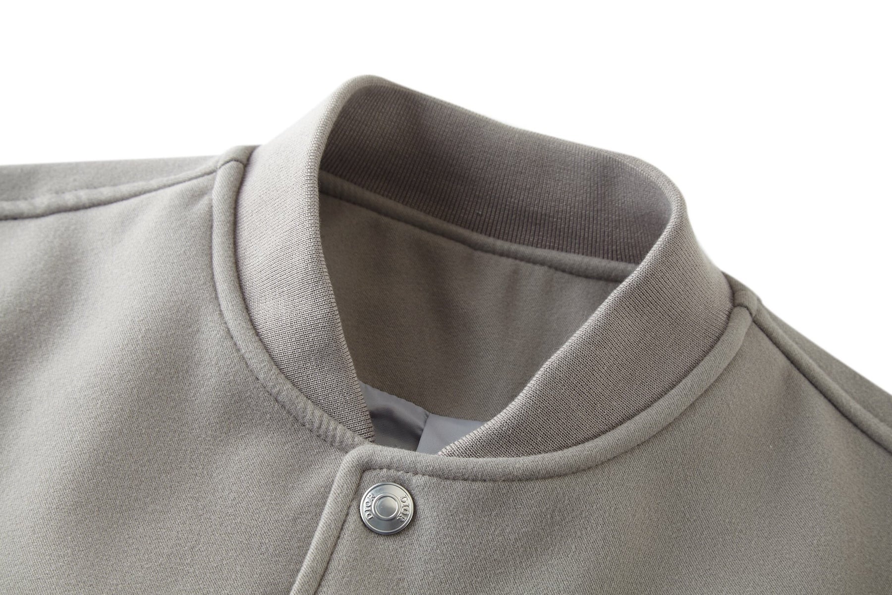 A refined Dior baseball jacket crafted from smooth suede with contrasting leather sleeves. Designed with a classic snap-button front, ribbed collar, cuffs, and hem, and angled side pockets for a timeless varsity silhouette. Clean, understated, and ideal for elevated everyday wear.