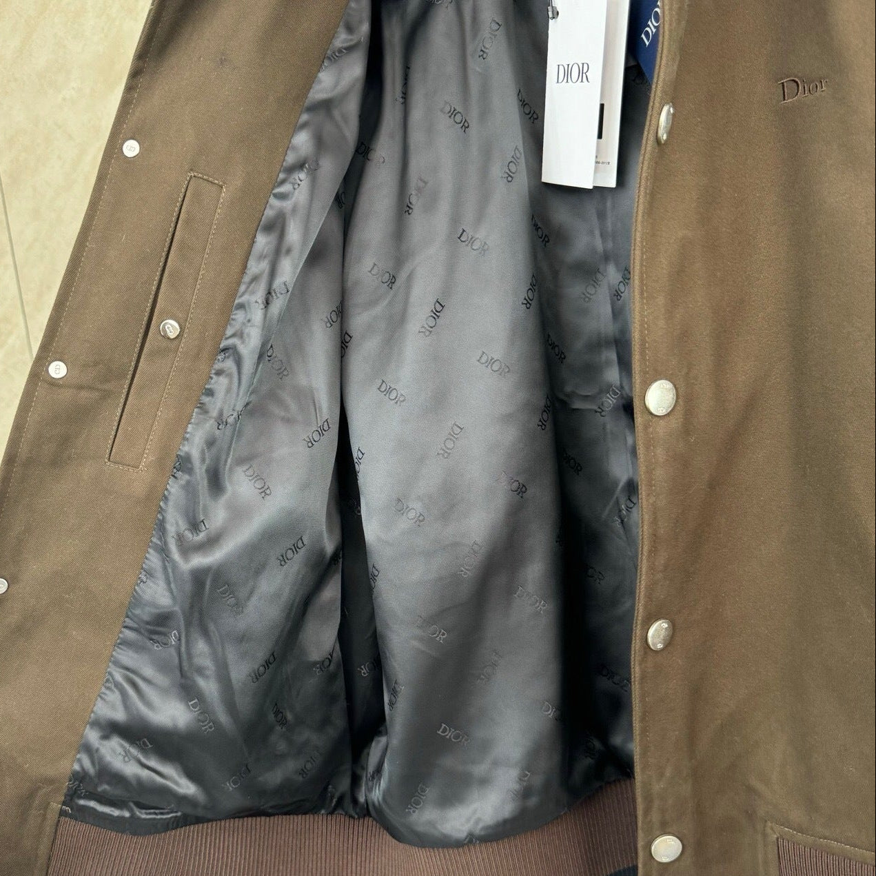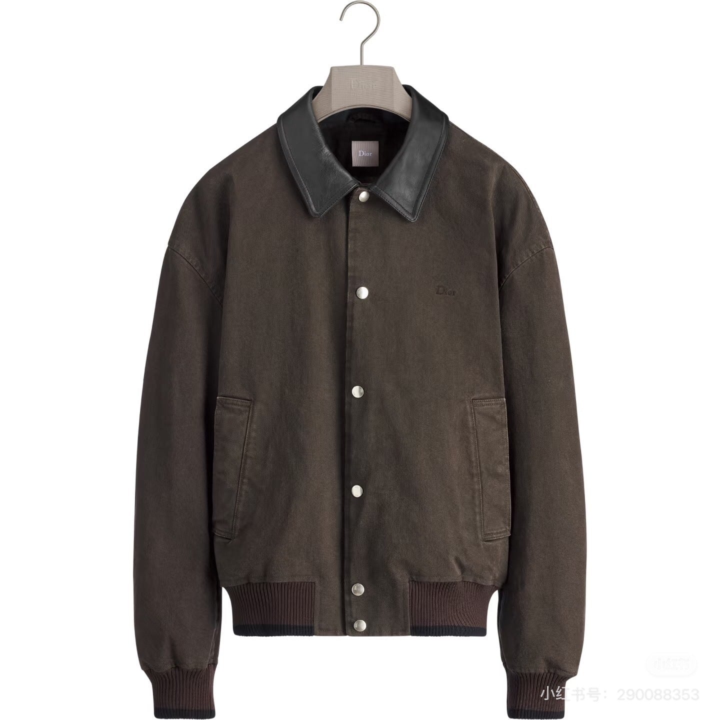 A premium Dior bomber jacket designed with a structured silhouette and understated luxury. Crafted in a rich brown fabric with a contrasting smooth leather collar, it features a snap-button front closure, ribbed cuffs and hem, and functional side pockets. Finished with subtle Dior branding, this piece delivers a perfect balance of elegance and modern casual wear.